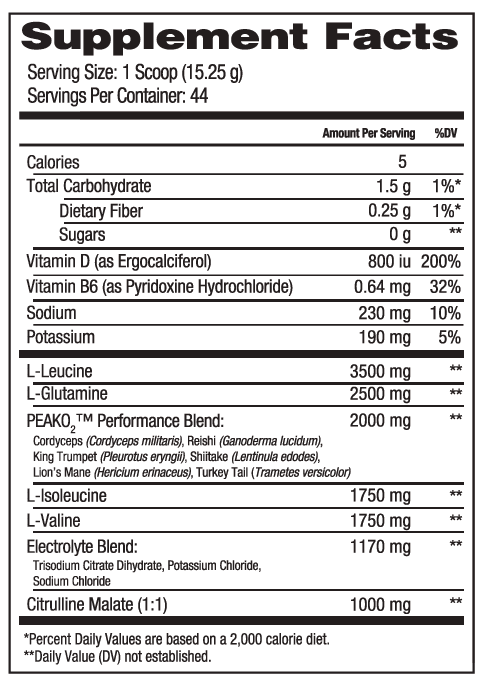 L-Leucina, L-Glutamina, Mezcla para la mejora del rendimiento PEAKO2™ (Cordyceps (Cordyceps militaris), Reishi (Ganoderma lucidum), seta de cardo (Pleurotus eryngii), Shiitake (Lentinula edodes), melena de león (Hericium erinaceus), Cola de pavo (Trametes versicolor)), L-isoleucina, L-Valina, mezcla de electrolitos (Citrato Trisódico Dihidrato, Cloruro de Potasio, Cloruro de Sodio), citrulina Malato (1:1), vitamina D (como Ergocalciferol), vitamina B6 (como clorhidrato de piridoxina), sodio, potasio.