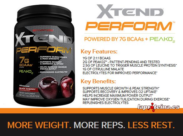 El nuevo Xtend™ Perform de Scivation contiene la clásica composición del suplemento superventas en todo el mundo Xtend™ BCAAs con la adición de la nueva mezcla patentada y probada en estudios clínicos PeakO₂™, diseñada para aumentar el rendimiento durante el entrenamiento.