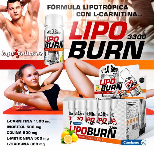 LipoBurn 3300 with L-carnitine de Vitobest es una potente fórmula en formato líquido de rápida asimilación, ideal para ayudar a quemar la grasa, gracias a la combinación de los mejores factores lipotrópicos (metionina, colina, inositol, tirosina y vitamina B6) con una potente dosis de L-carnitina (Carnipure™).