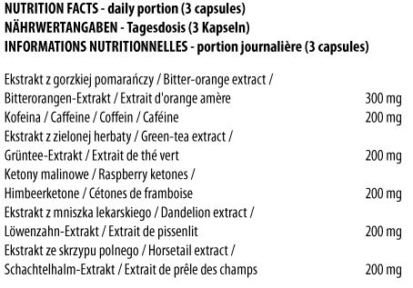 Extracto de fruta de naranja amarga (Citrus aurantium) extracto de hoja de té verde (Camellia sinensis), cafeína, extracto de cetonas de frambuesa, extracto de raíz de diente de león (Taraxacum officinale), extracto de cola de caballo (Equisetum arvense), antiaglomerante: estearato de magnesio, recubrimiento (celulosa, colorante: dióxido de titanio).