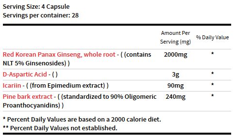 Raíz de Panax Ginseng koreano rojo, (contiene NLT 5% Ginsenosides), ácido D-aspártico, Icariin (extracto de Epimedium), extracto de corteza de pino (estandarizado a 90% de proantocianidinas oligoméricas).