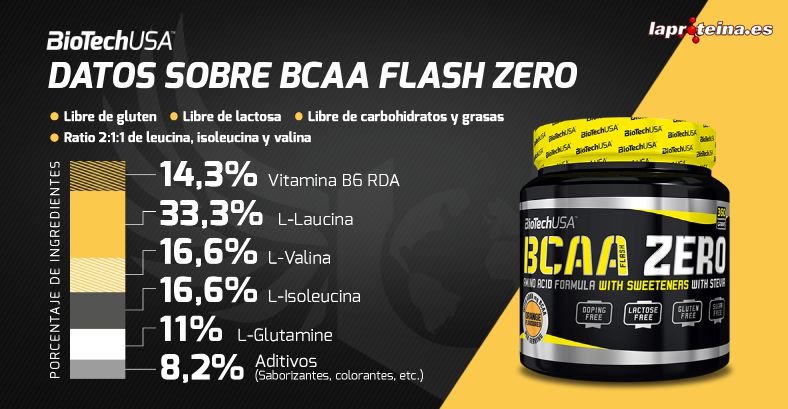 BCAA Zero de BioTech USA es un suplemento en polvo con un agradable sabor que contiene una fórmula con 6 gramos de aminoácidos de cadena ramificada con ratio 2:1:1 entre leucina, valina e isoleucina, 700 mg de L-Glutamina y vitamina B6.