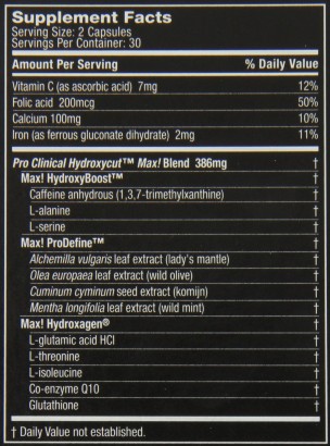 Pro Clinical Hydroxycut® Max! Blend: (Max! HydroxyBoost™: Cafeína Anhidra (1,3,7-Trimetilxantina), L-Alanina, L-Serina), (Max! ProDefine™: Extracto de Hoja Alchemilla Vulgaris, Extracto de Hoja de Olea Europaea, Extracto de Semilla de Cuminum Cyminum, Extracto de Hoja de Menta), Max! Hydroxage® (L-Ácido Glutámico HCl, L-Treonina, L-Isoleucina, Coenzima Q10, L-Glutatión), Vitamina C, Ácido Ascórbico, Ácido Fólico, Calcio, Hierro.