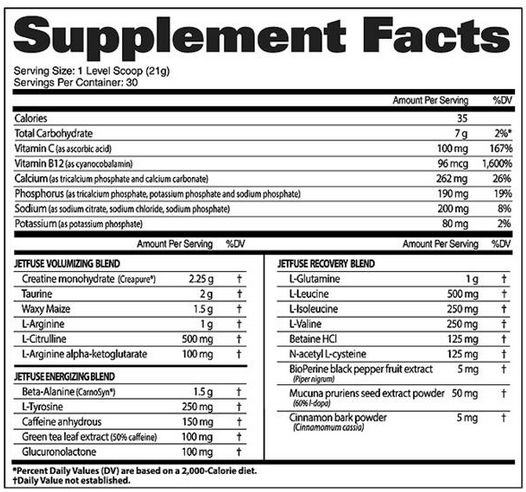 Jetfuse volumizing blend (Creatina Monohidrato (Creapure®), taurina, Maíz ceroso, L-Arginina, L-Citrulina, L-arginina alfa-cetoglutarato), Jetfuse energizing blend (Beta-alanina (CarnoSyn®), L-Tirosina, cafeína Anhidra, extracto de hoja de té verde (50% de cafeína), glucuronolactona, Jefuse mezcla de recuperación (L-glutamina, L-Leucina, L-Isoleucina, L-Valina, Betaína HCl, N-acetil L-cisteína, BioPerine extracto de fruta de pimienta negra (Piper nigrum), Mucuna Pruriens extracto de semilla en polvo (60% l-dopa), Polvo de corteza de canela (Cinnamomum cassia), Vitamina C (como ácido ascórbico), Vitamina B12 (como cianocobalamina), Calcio (como fosfato tricálcico y carbonato de calcio), Fósforo (como fosfato tricálcico, fosfato potásico y fosfato sódico), Sodio (como Citrato de Sodio, Cloruro de Sodio, Fosfato de Sodio), Potasio (como fosfato de potasio).