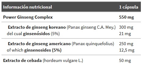 550 mg de ginseng koreano, ginseng americano y extracto de grano de cebada por cápsula. Mejora la atención mental y la vitalidad.