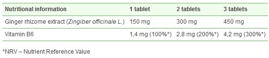 Extracto de rizoma de jengibre (Zingiber officinale L.) agentes de carga - celulosa microcristalina, isomaltosa; colorante alimentario - dióxido de titanio; agente de acristalamiento - polietilenglicol; sal de carboximetil celulosa de sodio reticulada; almidón de patata; agente antiaglomerante - sales de magnesio de ácidos grasos, dióxido de silicio; clorhidrato de piridoxina - vitamina B6, colorante alimentario.