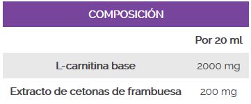 Agua, L-carnitina base, acidulante (ácido cítrico), cetonas de frambuesa, aromas, conservantes (benzoato sódico y sorbato potásico) y edulcorantes (sucralosa, acesulfamo K y sacarina sódica).