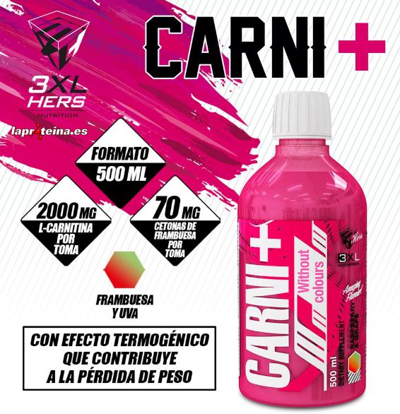 Carni+ de la marca 3XL® Nutrition dentro de su nueva línea especial para chicas activas 3XL® Hers es un suplemento en formato líquido para una rápida asimilación, que proporciona 2.000 mg de L-carnitina con 200 mg de extracto de cetonas de frambuesa por dosis de 20 ml.