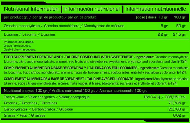 - Contiene monohidrato de creatina micronizado enriquecido con taurina.