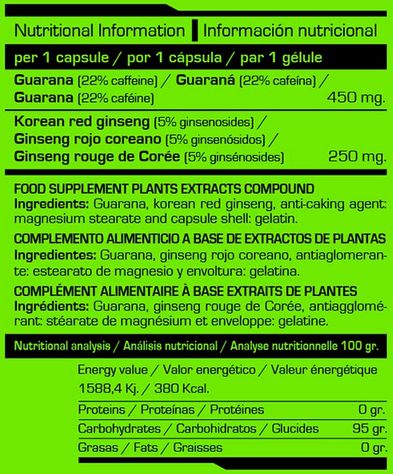 - Proporciona 450 mg de guaraná y 250 mg de ginseng rojo coreano por cápsula.