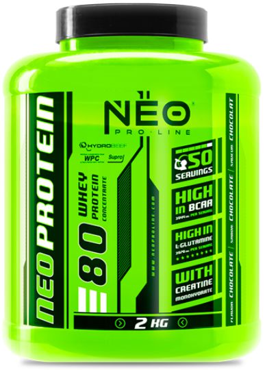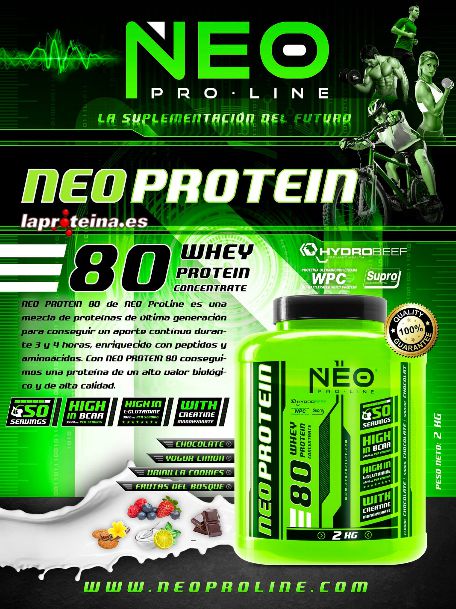 NEO Protein 80 de NEO Pro Line es un suplemento proteico en polvo compuesto por una mezcla proteica de gran calidad y con un alto valor biológico cuyo componente principal es el concentrado de suero de leche WPC.