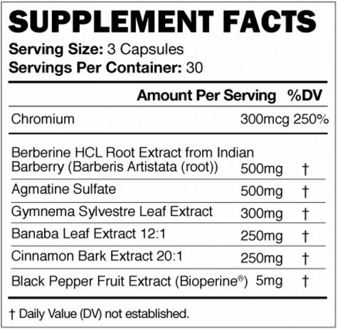 Berberina HCl procedente de extracto de raíz de Bérbero indio (Berberis Artistata), sulfato de agmantina, extracto de hoja de Gymnema Sylvestre, extracto de hoja de Banaba 12:1, extracto de corteza de canela 20:1, extracto de pimienta negra (Bioperine), cromo.