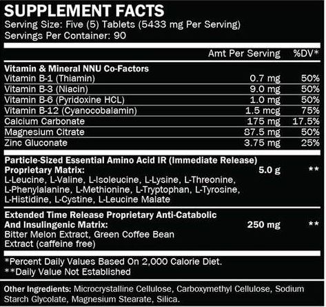 Mezcla patentada de aminoácidos esenciales IR (liberación inmediata) nanométricos (L-Leucina, L-Valina, L-isoleucina, L-lisina, L-fenilalanina, L-treonina, L-metionina, L-triptófano, L-tirosina, L-cisteína, L-Leucina Malato), matriz insulinogénica y anticatabólica patentada de liberación prolongada en el tiempo (extracto de melón agrío, grano de café concentrado), vitaminas y minerales cofactores NNU (vitamina B-1, vitamina B-3, vitamina B-6, vitamina B-12, Citrato de Magnesio, Carbonato de calcio, zinc Glucanato).