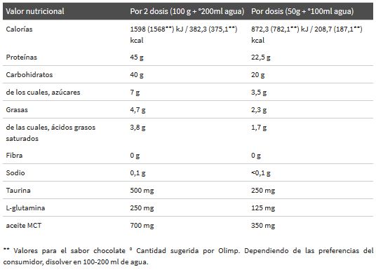 Fórmula avanzada de multi-proteínas e hidratos de carbono de alta calidad. 56% proteína y 40% carbohidratos, enriquecido con glutamina, taurina y aceite MCT.