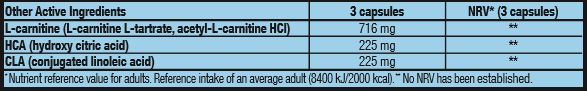 Agentes de carga (hidroxipropilmetilcelulosa, celulosa microcristalina), lecitina, CLA (ácido linoléico conjugado), quitosano, extracto de fruta de Garcinia cambogia, antiaglomerantes (estearato de magnesio, dióxido de silicio), extracto de hoja de té verde (Camellia sinensis), L-tirosina, L-metionina, L-carnitina-L-tartrato, L-carnitina, clorhidrato de L-carnitina, óxido de zinc, L-lisina, colorante (dióxido de titanio), picolinato de cromo, biotina.