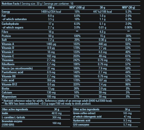 Complejo proteico (concentrado de proteína de suero, caseinato de calcio), Mezcla Ultra Loss [fibra (inulina), L-carnitina L-tartrato, enzima digestiva (bromelina), extracto de café verde, ácido hialurónico, Coenzima Q10], complejo de carbohidratos (maltodextrina, maíz ceroso), espesante (carboxi metil celulosa sódica), emulsificante (lecitina de soja), complejo de vitaminas (fosfatos de calcio, óxido de magnesio, ácido L-ascórbico, acetato de DL-alfatocoperilo, nicotinamida, acetato de retinilo, D-calcio Pantotenato, colecalciferol, mononitrato de tiamina, clorhidrato de piridoxina, riboflavina, ácido pteroylmonoglutámico, D-biotina, cianocobalamina), sal, aromas, edulcorantes (sucralosa, glicósidos de esteviol), reguladores de acidez (tartratos de potasio).