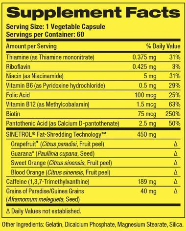 SINETROL® Fat-Shredding Technology® (Pomelo (Citrus paradisi, cáscara de fruta), Naranja dulce (Citrus sinensis, piel de fruta), Naranja sanguina (Citrus sinensis, piel de fruta), Guaraná (Paullinia cupana, Semilla)), semilla del paraíso (Aframomum melegueta, semilla), Cafeína (1,3,7-trimetilxantina), vitamina B1 (tiamina, mononitrato de tiamina), vitamina B2 (riboflavina), vitamina B3 (niacina), vitamina B5 (ácido pantoténico (como D-pantotenato de calcio), vitamina B6, biotina, vitamina B12 (como metilcobalamina), ácido fólico (folato).