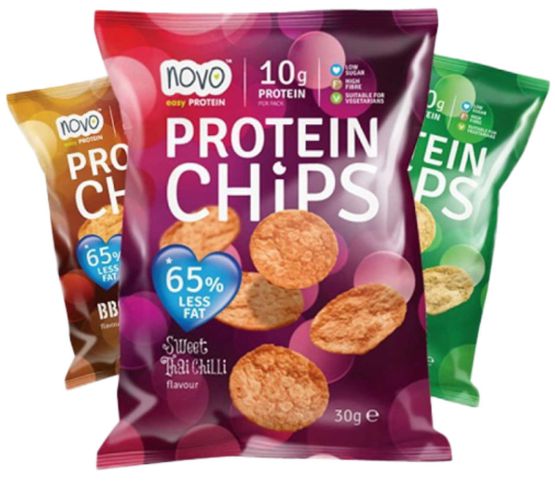 Protein Chips de Novo Easy Protein son unos deliciosos chips saludables, altos en proteínas y bajos en grasas que se presentan en bolsas individuales de 30 gramos con sabor a crema agría y cebolla, chili dulce tailandes o barbacoa.