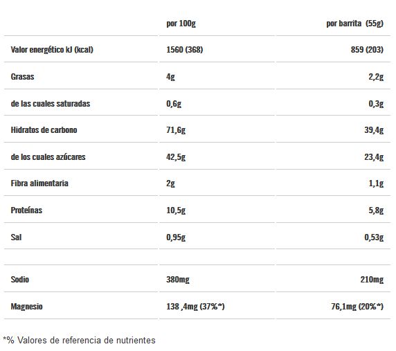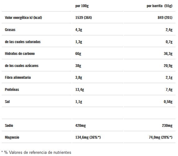 - Proporcionan 1,1 gramos de fibra, 210 mg gramos de sodio y 75 mg de magnesio por barrita.