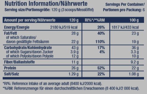 Naranja-chocolate negro: Harina de avena (gluten), aceite de coco refinado, concentrado de proteína de suero (de leche, emulgente: lecitina de soja), potenciador del sabor (xilitol), fibra de avena (gluten), trocitos de naranja liofilizados, cacao en polvo reducido en grasa (10-12%), proteína de clara de huevo, gasificantes (fosfato disódico, hidrogenocarbonato de sodio), aromas (chocolate praliné, chocolate, zumo de naranja), cloruro de sodio, corrector de acidez (ácido cítrico anhidro), edulcorantes (sucralosa, acesulfamo-K).
