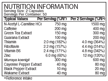 N-acetil L-carnitina HCl, extracto de hojas de Murraya koenigii, cápsula de gelatina, cafeína, extracto de té verde (Camellia sinensis, hoja), espesante (celulosa microcristalina), extracto de guaraná (Paullinia cupana, semilla), extracto de pimienta cayena (Capsicum annum, fruta) como MaxiTherm®, antiaglomerantes (sales de magnesio de ácidos grasos, dióxido de silicio), citrato de cinc, extracto de pimienta negra (Piper nigrum, fruta), clorhidrato de piridoxina, clorhidrato de tiamina, riboflavina.