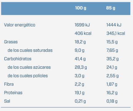 Recovery Cookie Chocolate: Copos de avena, azúcar, (14,6%) cobertura vegetal con leche [azúcar, grasa vegetal de palmiste totalmente hidrogenada, lactosa en polvo, leche entera en polvo (7%), cacao (Theobroma cacao L.) desgrasado en polvo (4%), emulgente (lecitina de soja) y aromas], huevo, aislado de proteína de soja, margarina [aceites y grasas vegetales (aceite de palma, aceite de coco y aceite de girasol), agua, emulgente (E471), corrector de acidez (ác. cítrico), conservador (E202), aromas, colorante (carotenos)], nuggets de soja (proteína de soja, almidón y sal), (4,6%) gotas de chocolate negro [azúcar, pasta de cacao, manteca de cacao, emulgente (lecitina de soja)], humectante (glicerina), miel, aromas, mezcla gasificadora [gasificantes (E450i, E500i y E500ii), almidón de maíz y emulgente (E471)], cacao (Theobroma cacao L.) en polvo, colorante (E150d), invertina (sacarasa, glicerina y agua) y cloruro sódico. Contiene huevo, soja, leche y gluten. Contiene trazas de sulfitos. Puede contener trazas de cacahuete, sésamo, frutos de cáscara y/o derivados de los mismos.