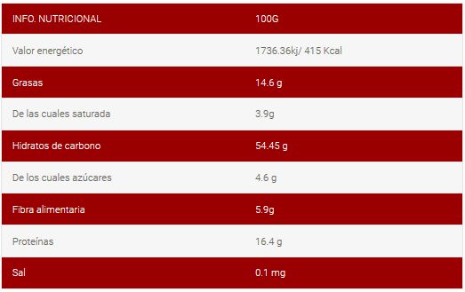 Cada 100 gramos de Harlems aporta unas 415 calorías procedentes de 14 gramos de grasa, 16 gramos de proteínas y 54 gramos de carbohidratos con tan solo 4 gramos de azúcares. Además, aporta 6 gramos de fibra que aumentará el poder saciante de este delicioso snack a la vez que nos ayudará a regular nuestra flora bacteriana aumentando su funcionalidad y mejorando así nuestro sistema inmunológico.