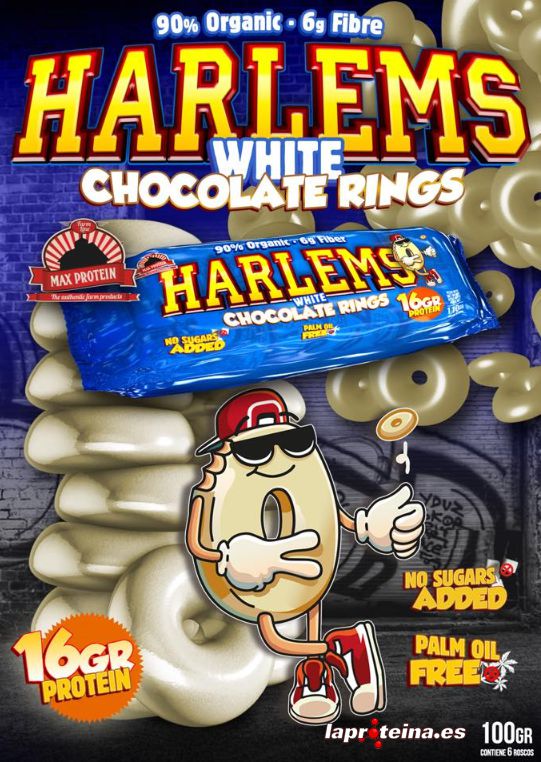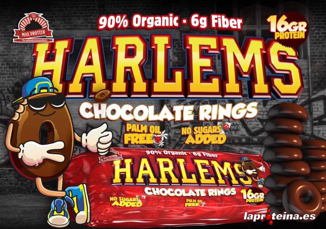 Harlems de Max Protein son unas deliciosas rosquillas crujientes bañadas en una suave y fina capa de chocolate desgrasado con un 16% de proteínas de alto valor biológico, un 90% ecológicas y sin azúcares añadidos.