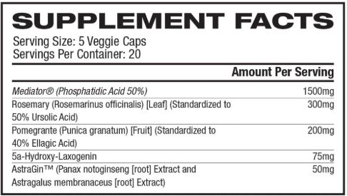 Mediator (ácido fosfatídico 50%), extracto de hoja de romero (rosmariuns officinalis) [Hoja] (Estandarizado al 50% de ácido ursólico), extracto de granada (Punica granatum) [Fruta] (Estandarizado al 40% de ácido elágico, proporcionando metabolito Urolitina B), 5a-hidroxi-laxogenina, AstraGin (extracto de Panax notoginseng [raíz] y extracto de Astragalus membranaceus [raíz]).