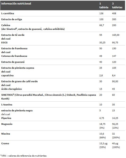 Agente de carga – celulosa microcristalina; L-carnitina-L-tartrato, extracto de ortiga, malato de magnesio, extracto de té verde, extracto de frambuesa, 4% cafeína, extracto de guaraná, agente de recubrimiento – glicol polietileno, talco, alcohol polivinilo (PVA), silicato de potasio aluminio, polioxietilen sorbitanmonooleato; extracto de pimienta cayena, extracto de grano de café verde, agente espesante - sodio carboxi metil celulosa entrecruzado; agente anti-apelmazante – sales de magnesio de ácidos grasos, dióxido de silicio; SINETROL® - extracto patentado de frutas cítricas y guaraná (Citrus paradisi Macafad., Citrus sinensis (L.) Osbeck, Paullinia cupana Kunth), ácido nicotínico – niacina, L-teanina, extracto de pimienta, 0,01% cromo picolinato, colorantes – dióxido de titanio.