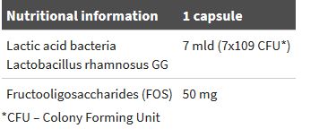 Maltodextrinas, cultivos vivos de bacterias Lactobacillus rhamnosus GG (ATCC 53103) microencapsulados, fructooligosacáridos (Orafti®), agentes antiaglomerantes - sales de magnesio de ácidos grasos, dióxido de silicio; cápsula (agente de glaseado - hidroxipropil metil celulosa, color: E 171).