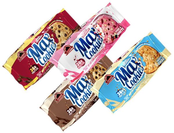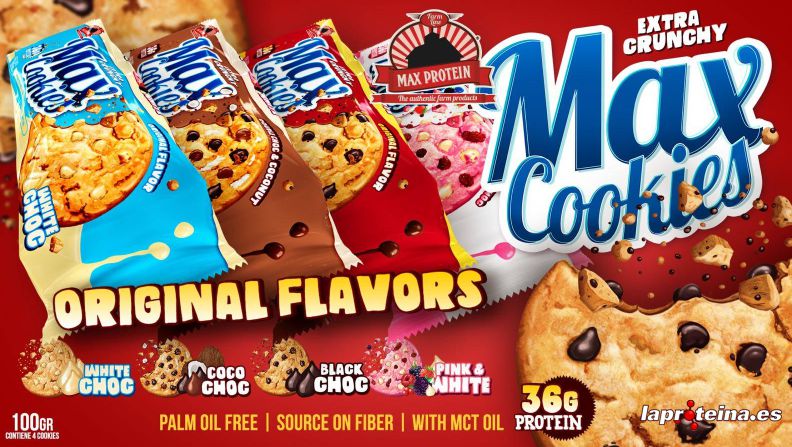 Max Cookies de Max Protein son unas deliciosas galletas de 25 gramos con el sabor de la auténtica galleta americana, altas en proteína que suponen una fantástica alternativa a las barritas y batidos de proteína y que podrás disfrutar en 4 deliciosas versiones de galleta con chocolate con coco, galleta con chocolate negro, galleta con choclate blanco y galleta pink & White.