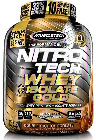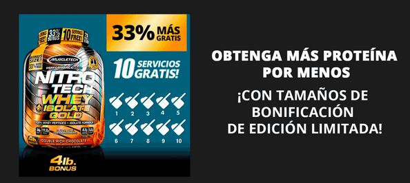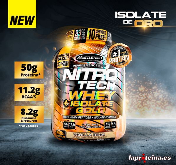 Presentamos la nueva Nitro Tech™ Whey + Isolate Gold, una fórmula que combina péptidos y aislado de suero de leche que se filtra en forma microscópica para eliminar los carbohidratos, grasas y lactosa mientras que al mismo tiempo se consigue retener una mayor cantidad de BCAAs, otros aminoácidos y glutamina.