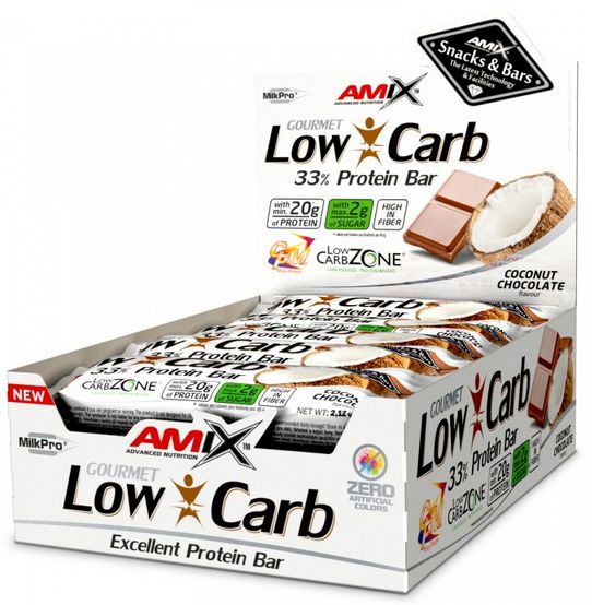 Low-Carb 33% Protein Bar de la marca nº1 en Europa Amix™ Nutrition son unas deliciosas y nutritivas barritas de 60 gramos con un 33% de proteína ideales para incrementar tu aporte proteico diario sin preocuparte por las calorías procedentes de los azúcares.