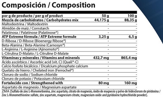 Maltodextrina, amilopectina de maíz, palatinosa (palatinose®), D-ribosa (Bioenergy Ribose®), beta alanina (Carnosyn®), L-arginina (Ajinomoto®), L-citrulina D-malato, ácido ascórbico (vitamina C) (Quali®-C), calcio fosfato bicálcico, aspartato de magnesio, ZMA (sulfato de zinc L-monometionina, zinc aspartato, citrato de magnesio, óxido de magnesio y polvo de hidrocloruro de piridoxina), quelato de hierro (Ferrochel®), cloruro de sodio, cloruro de potasio, acidulante: ácido cítrico monohidrato, aromas: piña y naranja, edulcorante: sucralosa y colorante E-133.