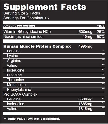 Human Muscle Protein Complex (L-Leucina, Lisina, Arginina, Valina, Isoleucina, Histidina, L-Treonina, L-Metionina, L-Fenilalanina), Pro BCAA Complex (Leucina, L-Isoleucina, L-Valina), Vitamina B6 (Piridoxina HCI), vitamina B3 (Niacinamida).