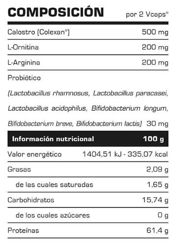 Contiene calostro, arginina, ornitina y probióticos para mejorar tu sistema inmunológico, mejorar el equilibrio hormonal y optimizar la recuperación del tejido muscular.