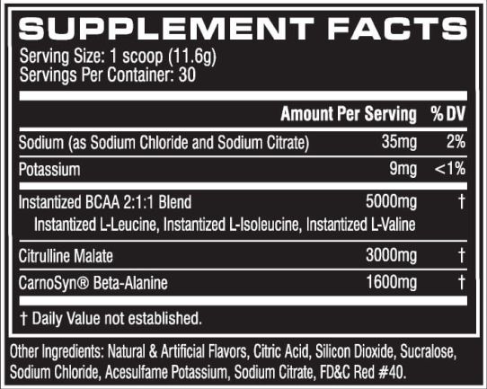 Mezcla de BCAAs instantáneos 2:1:1 (L-leucina instantánea, L-isoleucina instantánea, L-valina instantánea), L-citrulina malato, CarnoSyn® beta alanina, sodio (como cloruro de sodio y citrato de sodio), potasio, sabores naturales y artificiales, ácido cítrico, ácido málico, dióxido de silicio, sucralosa, acesulfamo K, colorante FD&C Rojo Nº 40.