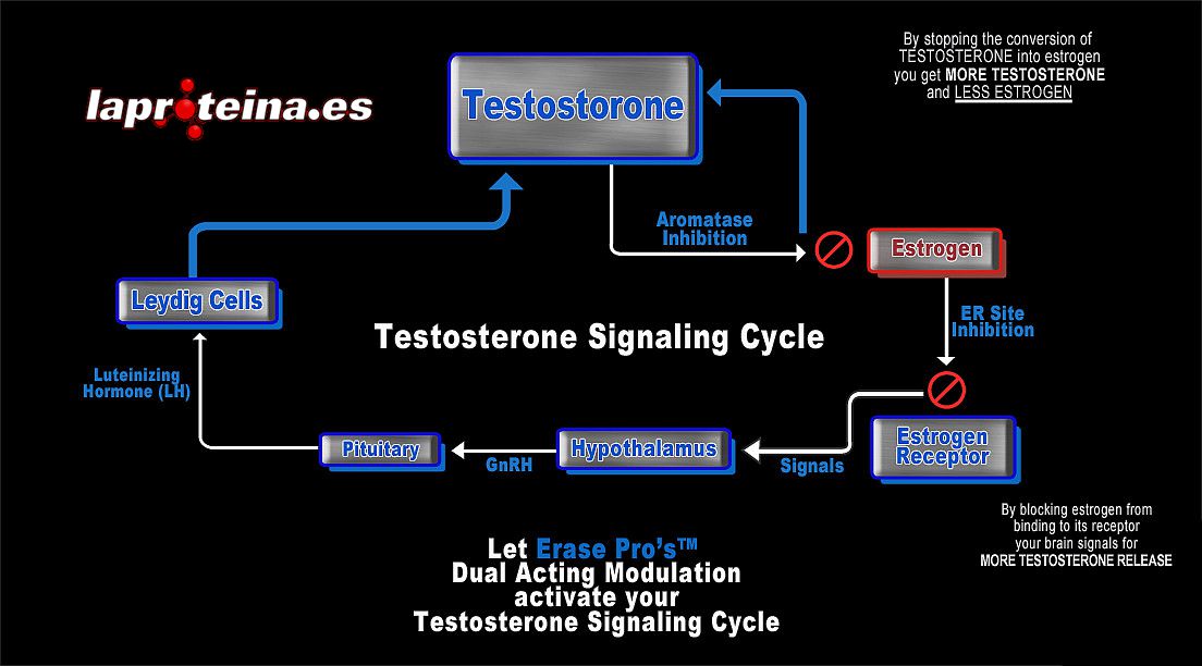 Nuestra fórmula se centra en novedosos ingredientes que trabajan conjuntamente. Este nuevo compuesto es un inhibidor irreversible de la aromatasa, la enzima del cuerpo que convierte la testosterona en estrógenos. Cuando esta enzima se inhibe no sólo disminuye los niveles de estrógenos sino que también aumenta los niveles de testosterona. Se consigue un 2 por 1 en la modulación anabólica.