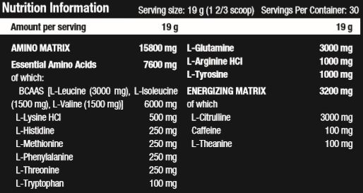 L-citrulina, L-glutamina, L-leucina, correctores de acidez (ácido DL-málico, hidrogenofosfato de dipotasio), L-isoleucina, L-valina, L-arginina clorhidrato, L-tirosina, aromas (manzanas), L-lisina clorhidrato, cloruro de sodio, L-histidina, L-metionina, L-fenilalanina, L-treonina, lecitina de soja, edulcorante (sucralosa), antiaglomerante (estearato de magnesio), cafeína anhidra, L-teanina, L-triptófano.
