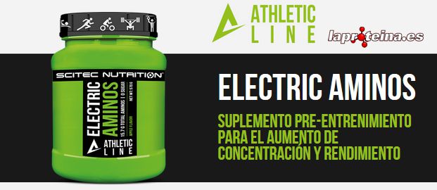 Electric Aminos de Scitec Nutrition dentro de su nueva línea para deportistas profesionales Athletic Line es un suplemento en polvo diseñado para antes o durante el entrenamiento para mejorar el rendimiento y la concentración mental gracias a una combinación de 15,7 gramos de aminoácidos y 3,2 gramos de un potente complejo energizante.