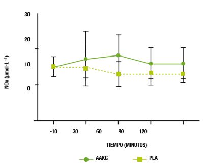 Concentración plasmática de óxido nítrico antes y después del ejercicio en dos grupos: uno suplementado con L-arginina (AAKG) y otro con placebo (PLA). Adaptado de Alvares et al 2012.