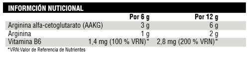 Sabor limón: Arginina alfa-cetoglutarato (AAKG), L-arginina HCl, maltodextrina, zumo de limón en polvo, acidulante (ácido cítrico), aromas, antiaglomerante (dióxido de silicio), edulcorantes (sacarina y sucralosa), vitamina B6 (clorhidrato de piridoxina) y colorante (tartrazina).