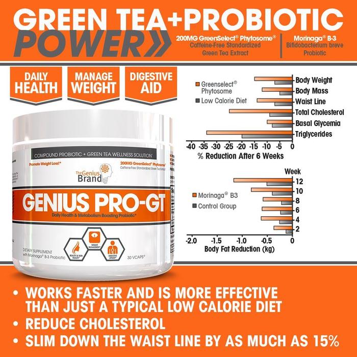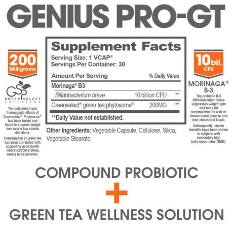 Genius Pro-GT de The Genius Brand es un suplemento en cápsulas que contiene una forma de vanguardia de té verde (GreenSelect® green tea Phytosome®) que ha sido probado científicamente para estimular el metabolismo, además de ser rico en antioxidantes que combaten los radicales libres para promover una mejor salud y bienestar en general; en combinación con una forma especial de probiótico (Morinaga® B3) que puede ayudar a mejorar la eficiencia del sistema digestivo y apoyar una mejor descomposición de los nutrientes a la vez que ayuda a combatir las flatulencias y la hinchazón digestiva.
