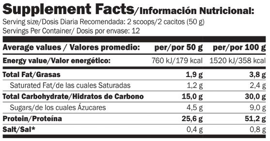 Sabor chocolate: Mezcla de proteínas Amix® 53% (proteína aislado de suero de leche, aislado y concentrado de proteína de suero de leche CFM®, concentrado de proteína de suero de leche) harina de arroz instantánea extrusionada, leche desnatada en polvo, cacao en polvo, estabilizantes: goma xantana y goma guar; aroma, sal, edulcorante: sucralosa.