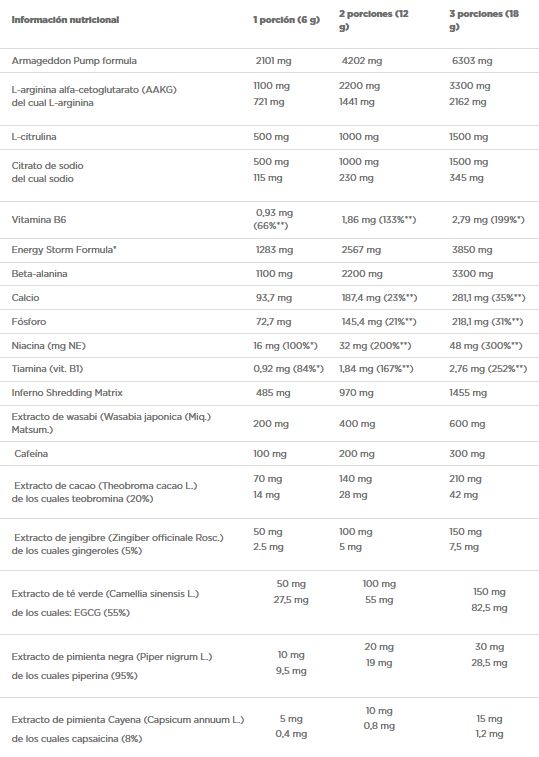 Beta-alanina, L-arginina alfa-cetoglutarato, aromas, correctores de acidez (ácido cítrico, ácido málico), espesantes (goma arábiga, goma xantana, carboximetilcelulosa sódica), L-citrulina, citrato de sodio, sales cálcicas de ácido ortofosfórico (fosfato de calcio), extracto de wasabi [Wasabia japonica (Miq.) Matsum., raíz], antiaglomerante (dióxido de silicio), cafeína, extracto de cacao (Theobroma cacao L., semilla), extracto de jengibre (Zingiber officinale Rosc., rizoma), extracto de té verde (Camellia sinensis L., hojas), edulcorantes (acesulfamo-K, sucralosa), nicotinamida (niacina), extracto de pimienta negra (Piper nigrum L., fruto), extracto de pimienta Cayena (Capsicum annuum L., fruto), clorhidrato de piridoxina (vitamina B6), clorhidrato de tiamina (vitamina B1), colorante (carotenos).
