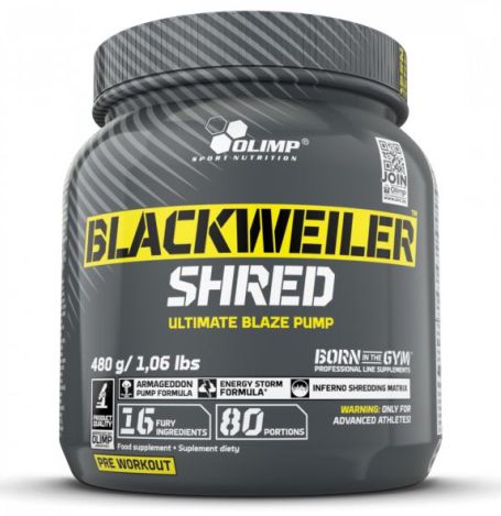 BlackWeiler® Shred de Olimp Sport es el pre-entreno concentrado más brutal diseñado hasta la fecha, ahora también con efecto termogénico para que te deshagas de la grasa a la vez que consegues una gran congestión muscular, un aumento de la fuerza, del tamaño muscular, de la motivación y de la concentración mental.
