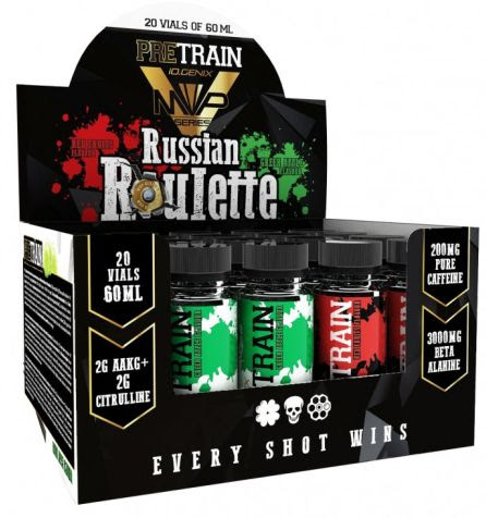 Russian Roulette de IO.Genix es un suplemento en viales individuales líquidos que contiene una fórmula de pre-entrenamiento de rápida acción diseñada para encender tu entrenamiento incrementando los niveles de energía, mejorar la fuerza, la resistencia y la intensidad durante el entrenamiento.