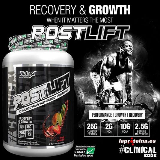 PostLift™ de Nutrex Research es un nuevo suplemento en polvo para tomar después del entrenamiento, clínicamente dosificado y diseñado específicamente para mejorar los procesos de recuperación y ayudarte a ganar masa muscular.