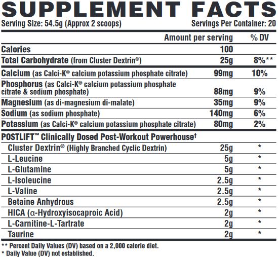 La mezcla de 10 gramos de aminoácidos esenciales (BCAAs), 5 gramos de glutamina, 2 gramos de HICA, 2,5 gramos de betaína anhidra, 2 gramos de taurina y 2 gramos de L-carnitina tartrato que contiene PostLift™ es una de las más potentes del mercado.